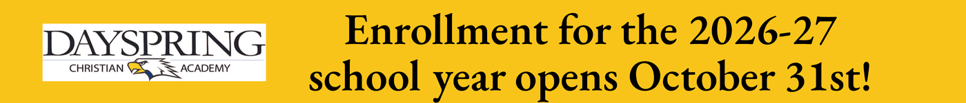 At Dayspring Christian Academy, our mission is to glorify God by partnering with Christian families in the spiritual discipleship and academic education of each enrolled student. Admission to Dayspring is open to Christian families who wish to collaborate in providing Christian education for their children. At least one parent must agree to our statements of faith, identify as a professing Christian, and regularly attend a Bible-teaching church.