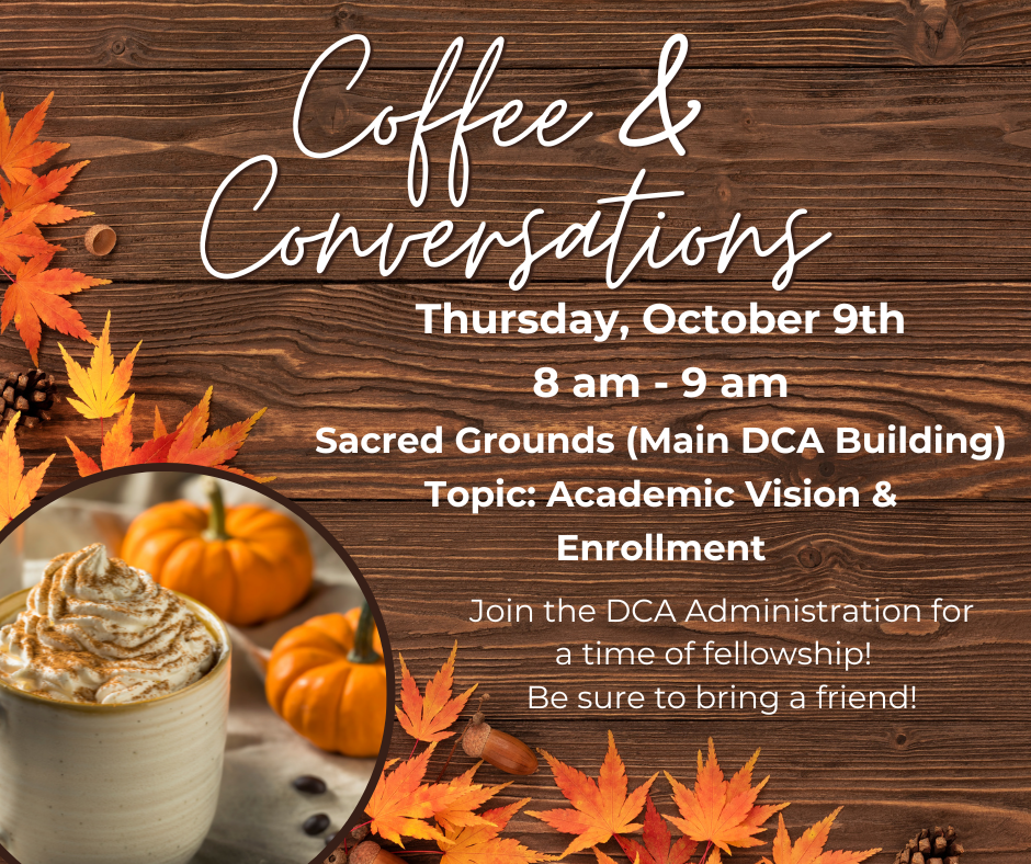 Join us for Coffee and Conversations on Thursday, October 9th, from 8:00 to 9:00 AM in Sacred Grounds located in the main DCA building. We will discuss the academic visions for each of our schools—elementary, middle, and high school—as well as the upcoming enrollment season for the 2026-27 school year.