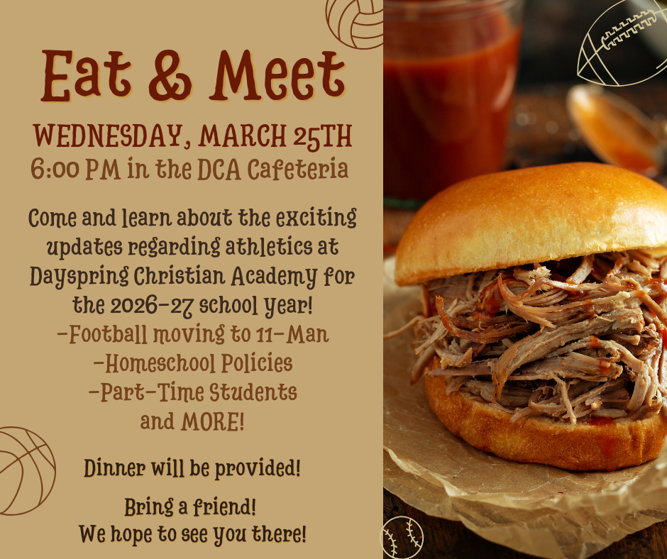 Dayspring Christian Academy 3734 W 20th St,, Greeley,, CO, United StatesCome and learn about the exciting updates regarding athletics at Dayspring Christian Academy for the 2026-27 school year! -Football moving to 11-Man -Homeschool Policies -Part-Time Students and MORE!